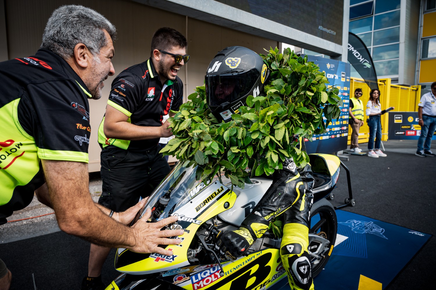 Proprio Cristian Borrelli (Bucci Moto Factory) ha sbancato il weekend capitolino del Dunlop CIV PreMoto3, conquistando la vittoria nelle due gare in programma. Una doppietta che gli consente di appropriarsi della seconda posizione in campionato a soli 3 punti dal capo-classifica Gionata Barbagallo (Team Echovit Pasini Racing), con un terzo ed un quarto posto detentore della tabella leader tricolore di categoria.