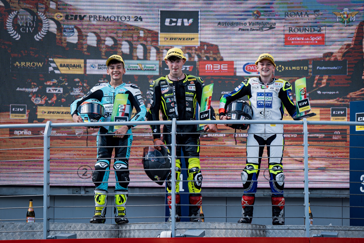 Il podio tutto Pata Talenti Azzurri FMI di Gara 1 del Dunlop CIV PreMoto3 a Vallelunga con Cristian Borrelli, Edoardo Savino e Gionata Barbagallo